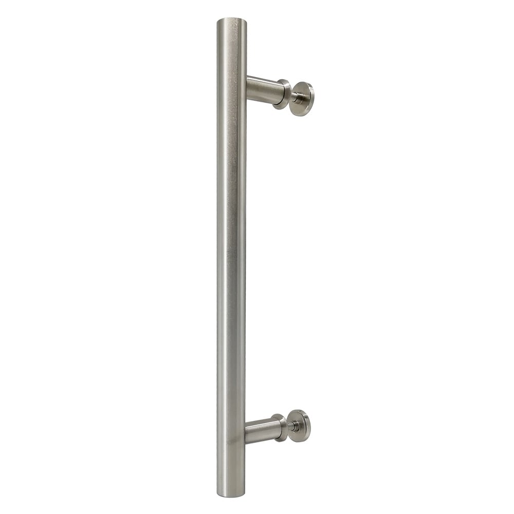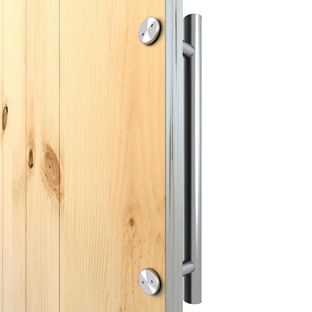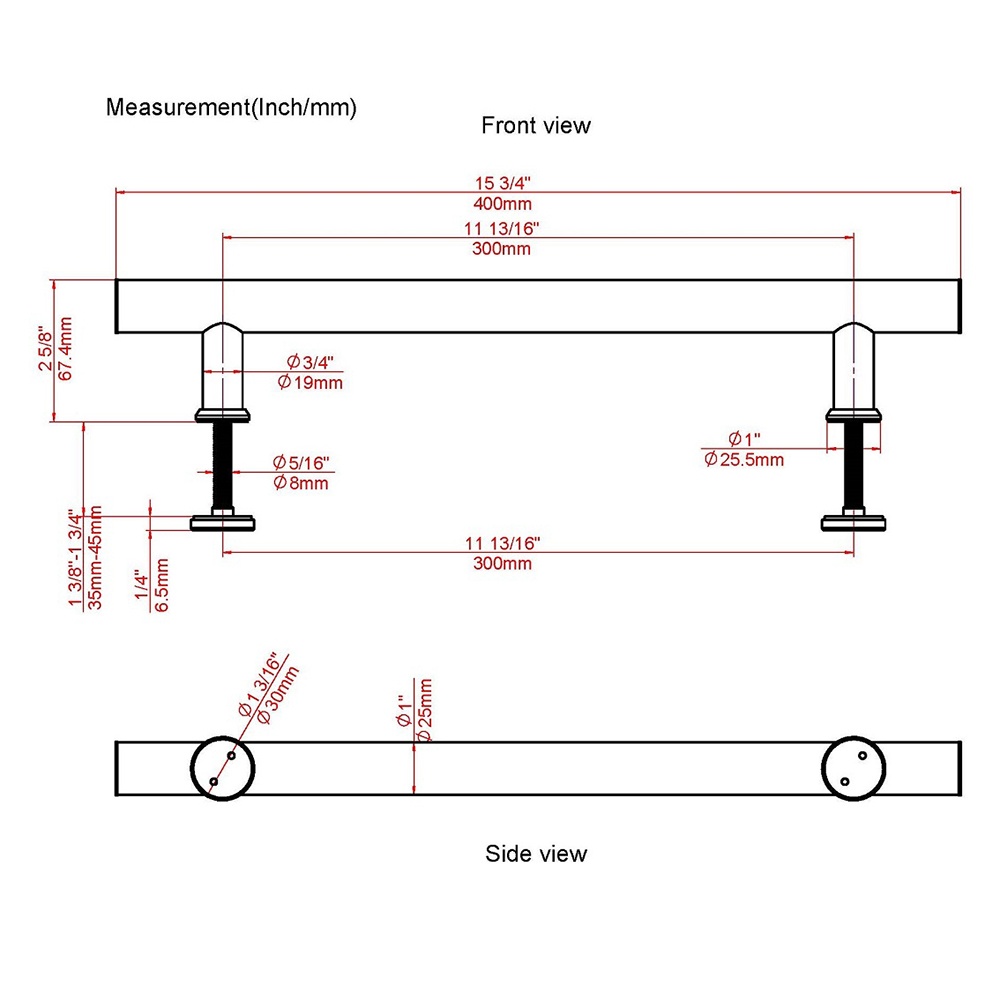 Length: Overall length :15-3/4″, cross-section diameter 1″, hole center:11-13/16″, it works on doors thickness of 1-3/4″ or 1-3/8″, handle depth towards door surface 2-5/8″.