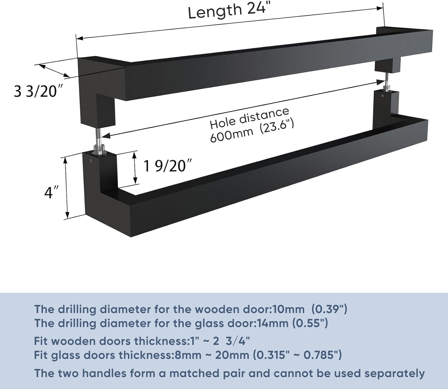 - Package Includes:A pair of 24 inch handles(2 pieces) and all necessary hardware (for one door). The two handles cannot be installed separately, if your door is a double door, you need 2 pairs (4 pieces).