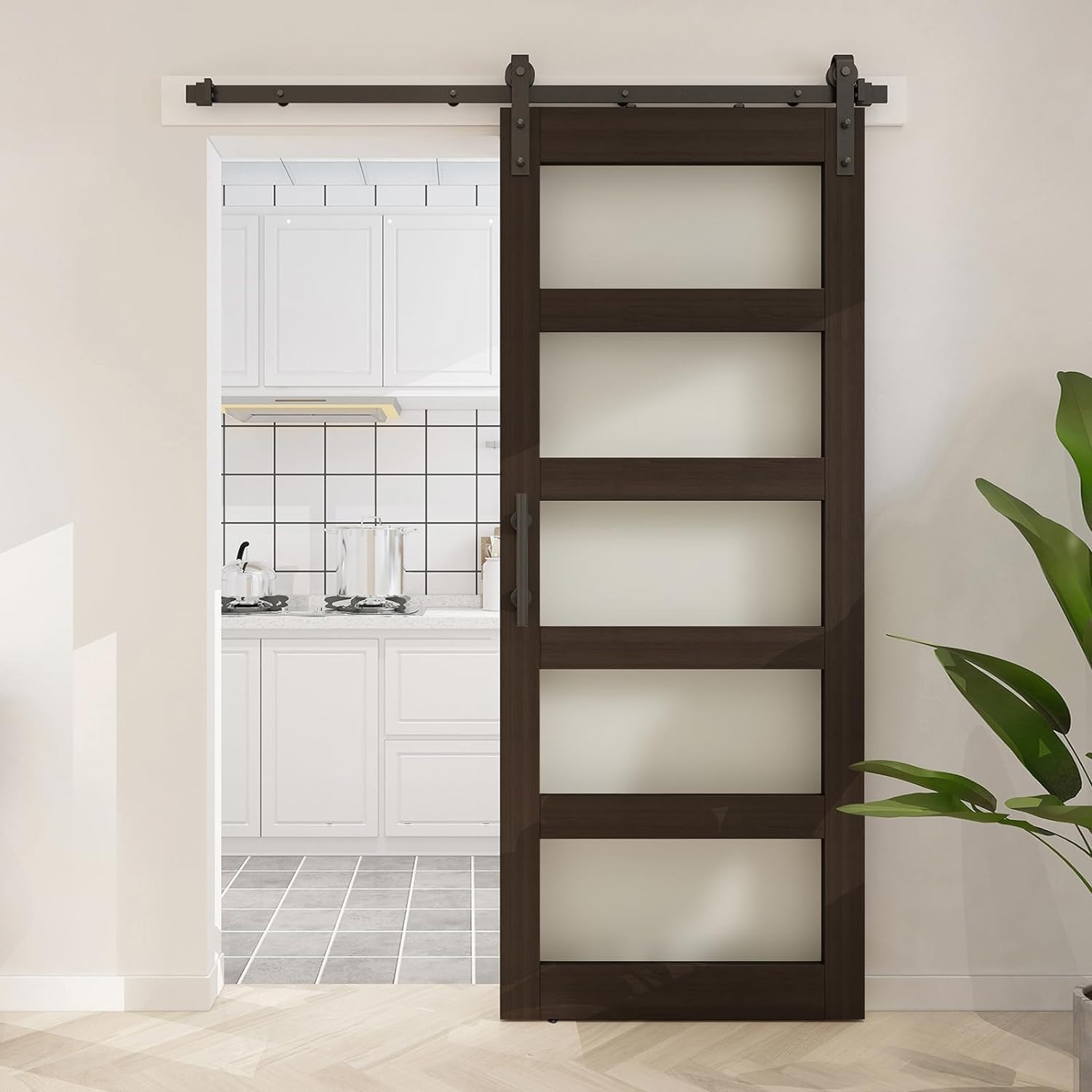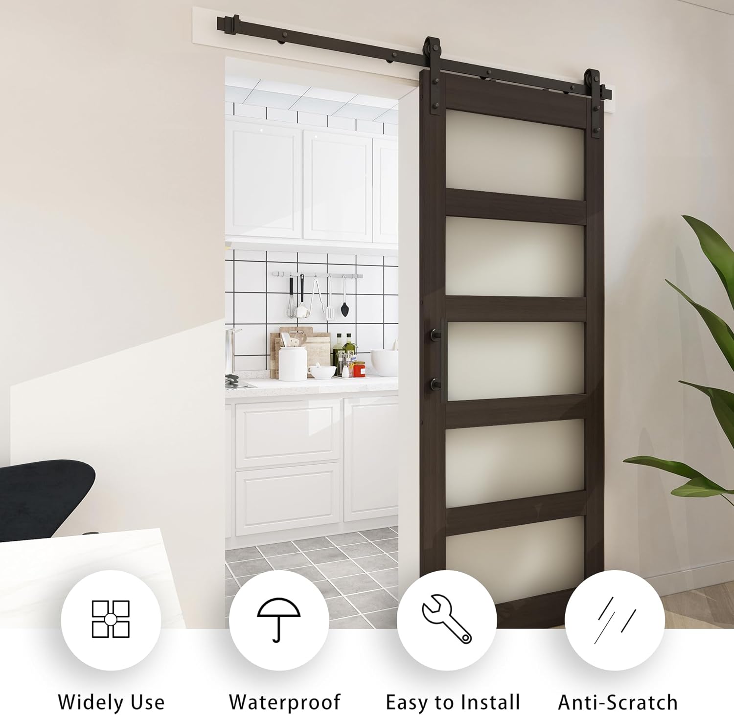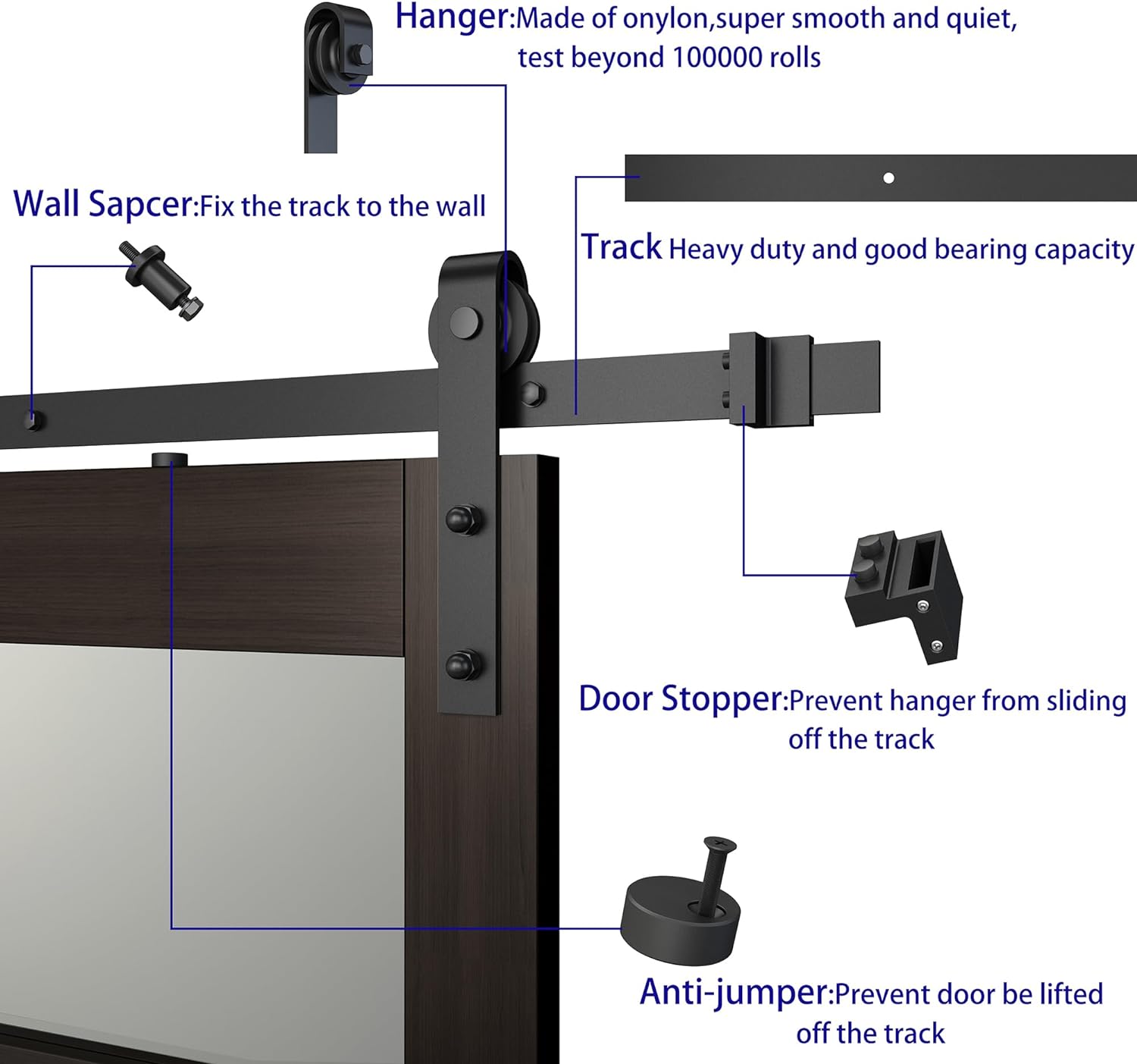 –EASY TO ASSEMBLE AND INSTALL: Accessories are complete and the pre-drilled holes for the barn door ensure speed and ease of installation. The bottom of the door has a pre-made groove for the floor guide.We also provide a detailed professional installation manual for your reference.