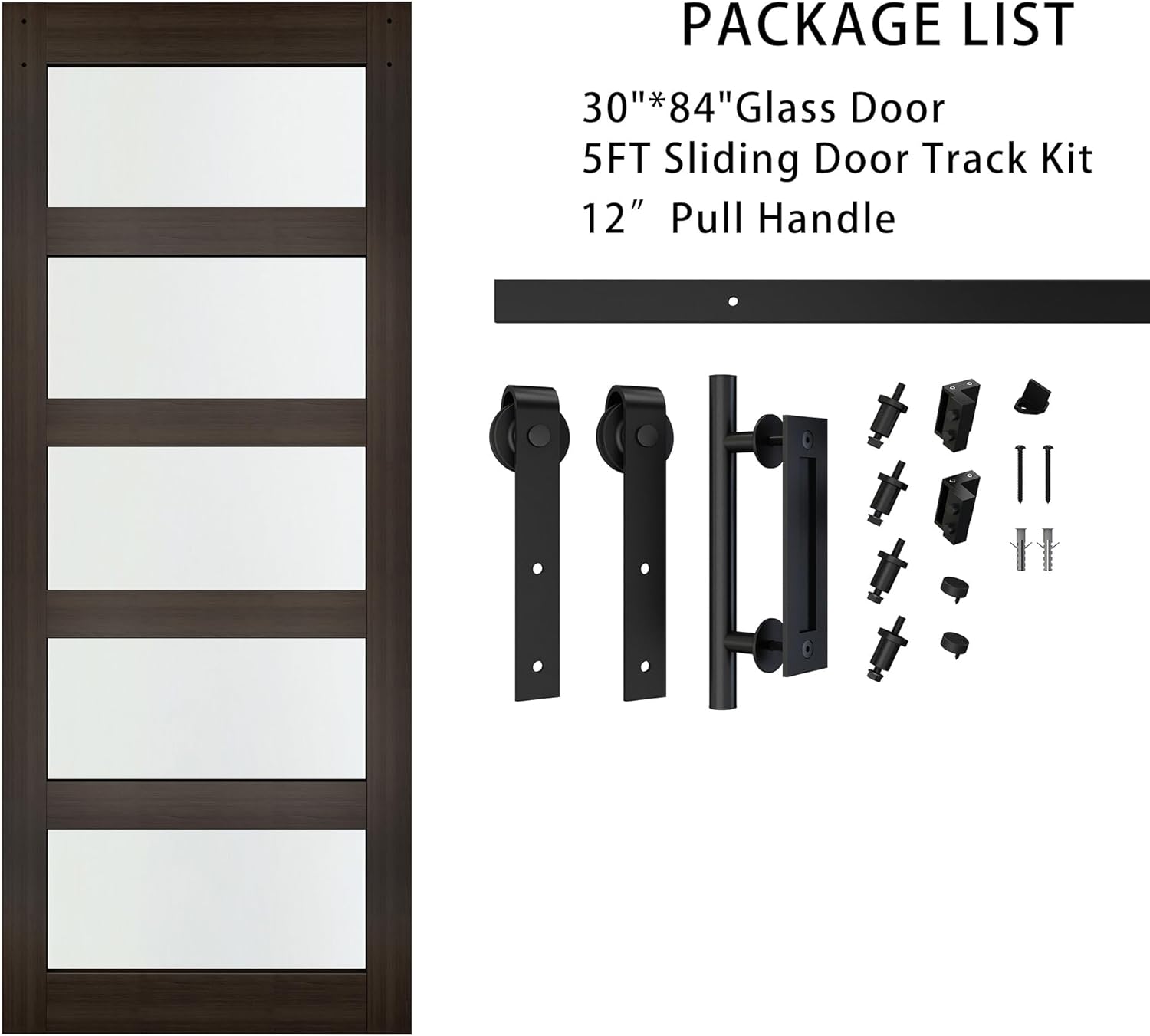 –PACKAGE LIST: 30″(W)x84″(H)x 1 3/8″(THK)door(assemble required),5FT black sliding door hardware kit,12″ black handle,floor guide,Allen Key,installation manual.