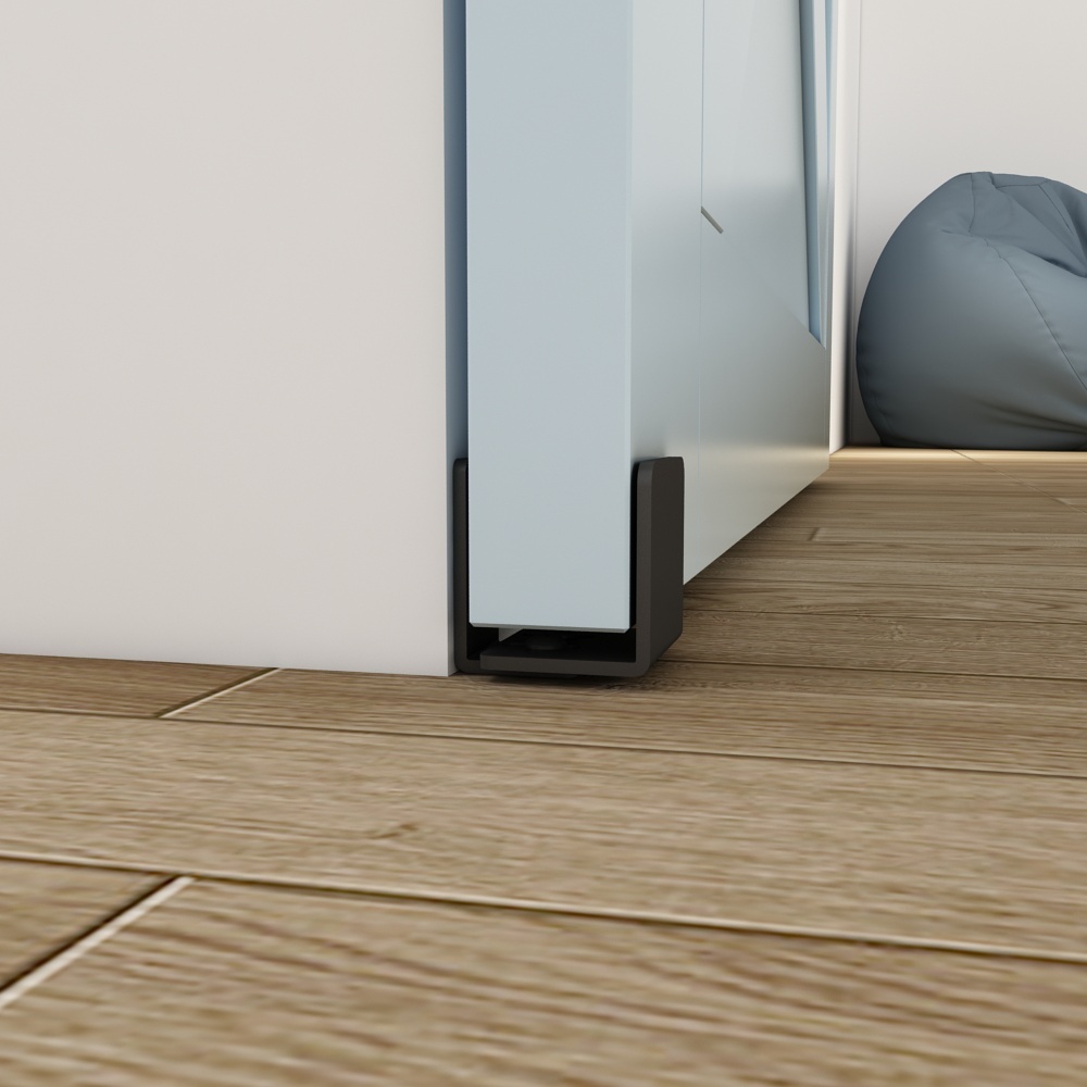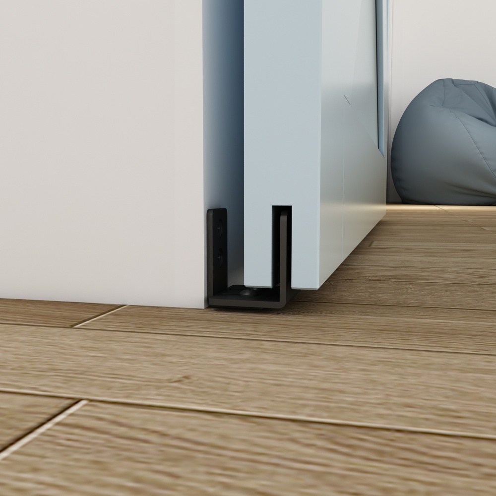 Multiple Installation Styles: you could cut a groove at the bottom of door, or placed floor guide on both sides of the door, let the door slide in between.