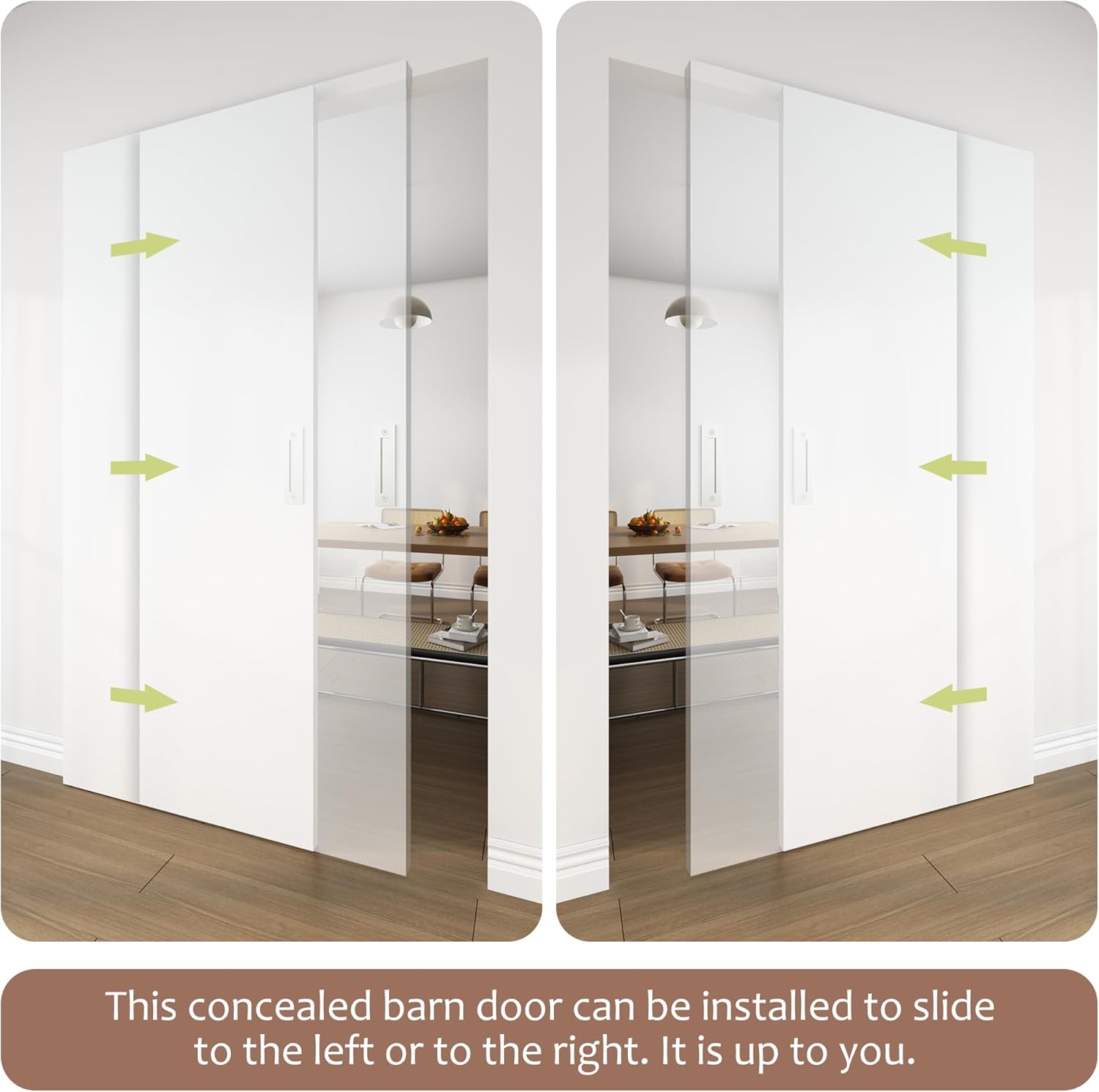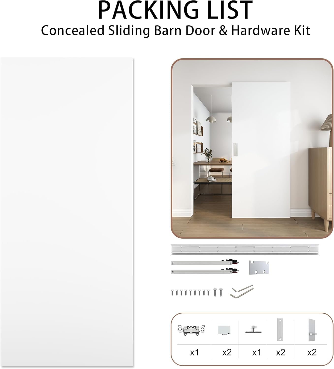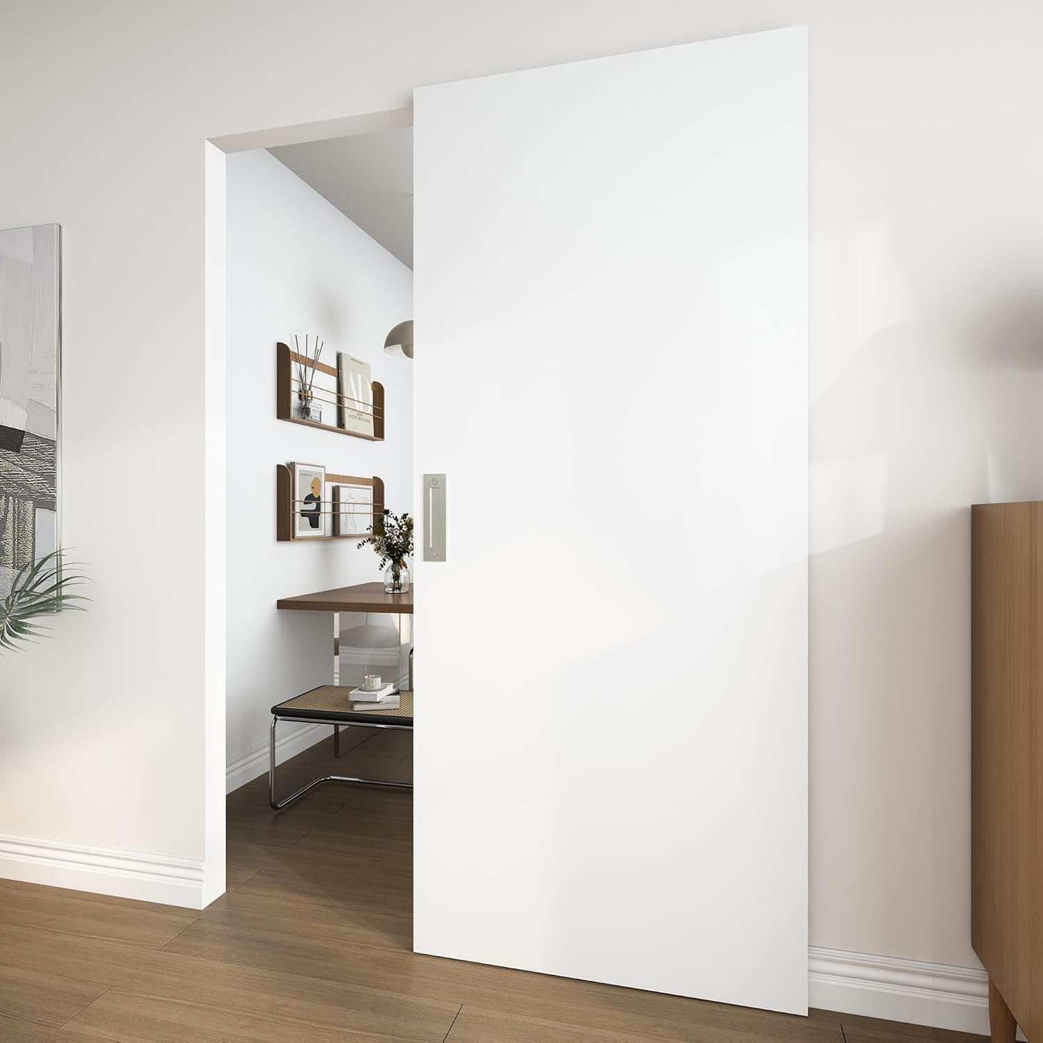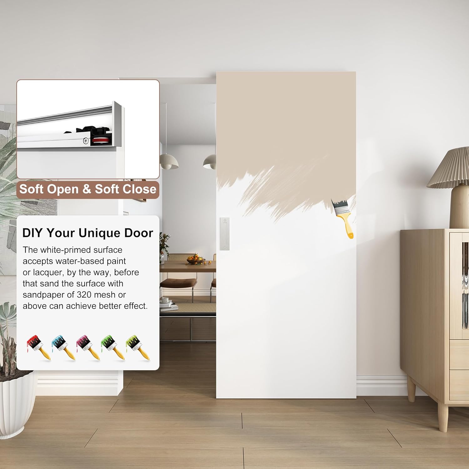 - Sleek Design: White primed door is simple and stylish. The invisible track design creates the illusion of a floating door, with the hidden rail to enhance the modern aesthetic of the space.
