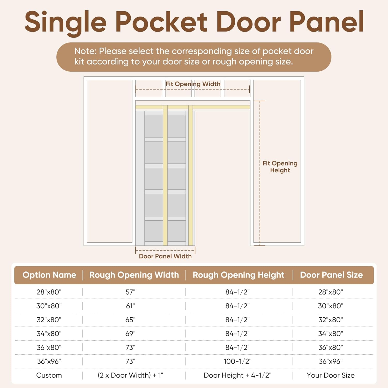 • Specifications: The pocket door kit is suitable for door thickness 1″ to 1-3/4″, Door width 24″ to track width(if the track width is 28″, then it would be 24″ t0 28″), Door height 80″. Track can be cut down to fit custom opening width as we also mark the major size on the wood header. If you want to fit a shorter door, the studs also can be cut, just operate carefully.