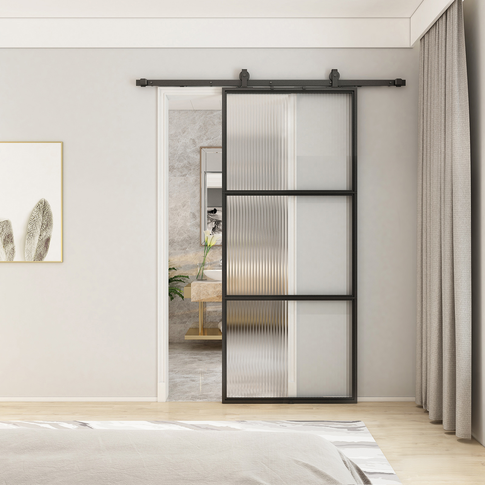 -Wide Applicability: Elegant and modern reeded glass sliding doors not only saves space, but also ensures the privacy and lightness. For internal doors, can be used for barn, sheds, cupboard, closets, kitchen, living room, study room, lavatory, bathroom,office and so on.